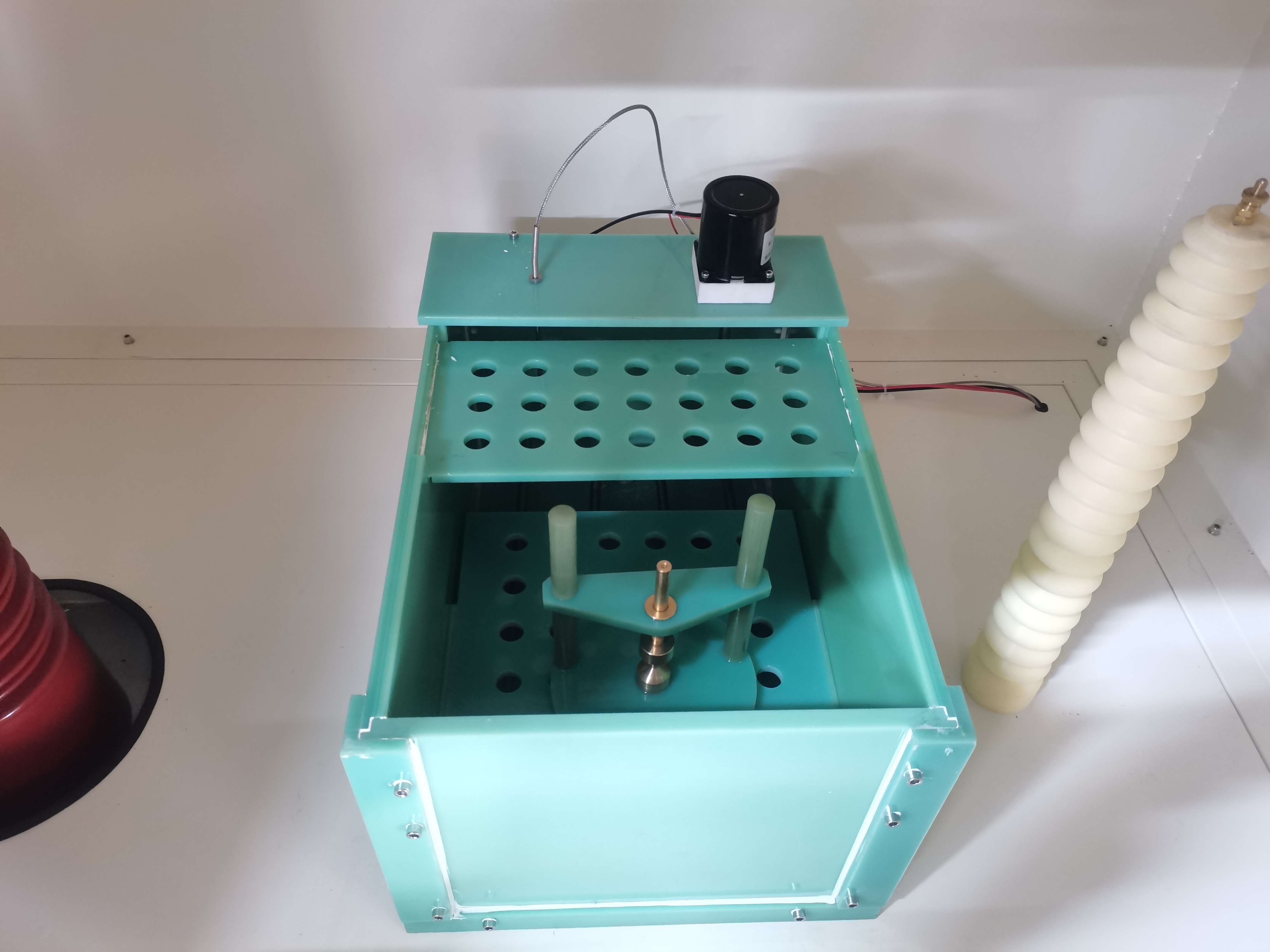 設(shè)備配有三色報(bào)警燈,綠燈亮?xí)r表示箱門(mén)關(guān)閉良好可以開(kāi)始試驗(yàn),黃燈亮?xí)r表示試驗(yàn)箱門(mén)打開(kāi),此時(shí)可進(jìn)行試樣更換。紅燈亮?xí)r表示高壓大于0.5KV,此時(shí)不要開(kāi)箱門(mén)。直流試驗(yàn)結(jié)束放電過(guò)程警報(bào)燈會(huì)閃爍且報(bào)警。(總結(jié):綠燈箱門(mén)關(guān)閉良好,黃燈開(kāi)門(mén)小心操作,紅燈有高壓)