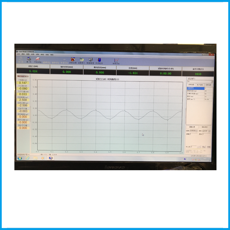 5.1軟件面板除下拉式菜單外,有同時顯示試驗力、位移、變形、時間、疲勞次數(shù)及當(dāng)前試驗速度的窗口。試驗力顯示窗口,除實時動態(tài)顯示試驗力外,還有試驗力的峰值顯示窗口(即試驗中的最大值)、試驗力的谷值顯示窗(即試驗中的最小值)、試驗力的均值顯示窗(即試驗中的平均值)等其它窗口。